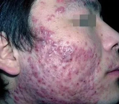 初級(jí)和中級(jí)癥狀皆有,粉刺痘痘的數(shù)量是大于一百個(gè),然后還有帶結(jié)節(jié)性的囊腫,像大包塊一樣的那種叫結(jié)節(jié)型的,小于三個(gè)左右,像這個(gè)就屬于結(jié)節(jié)型的激素臉了。