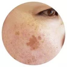 特點(diǎn)描述:顏色深淺不一,形狀大小不規(guī)則,有的可大于1厘米,大多出現(xiàn)在臉頰和經(jīng)常暴曬的部位。